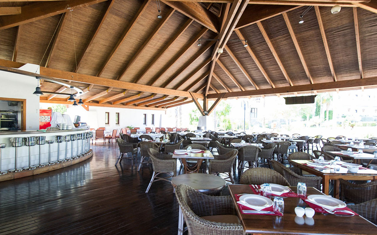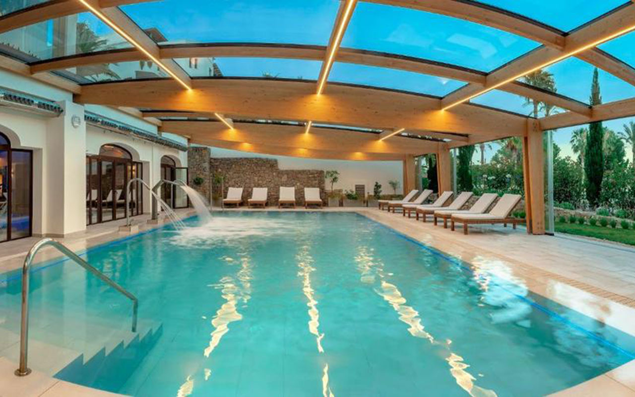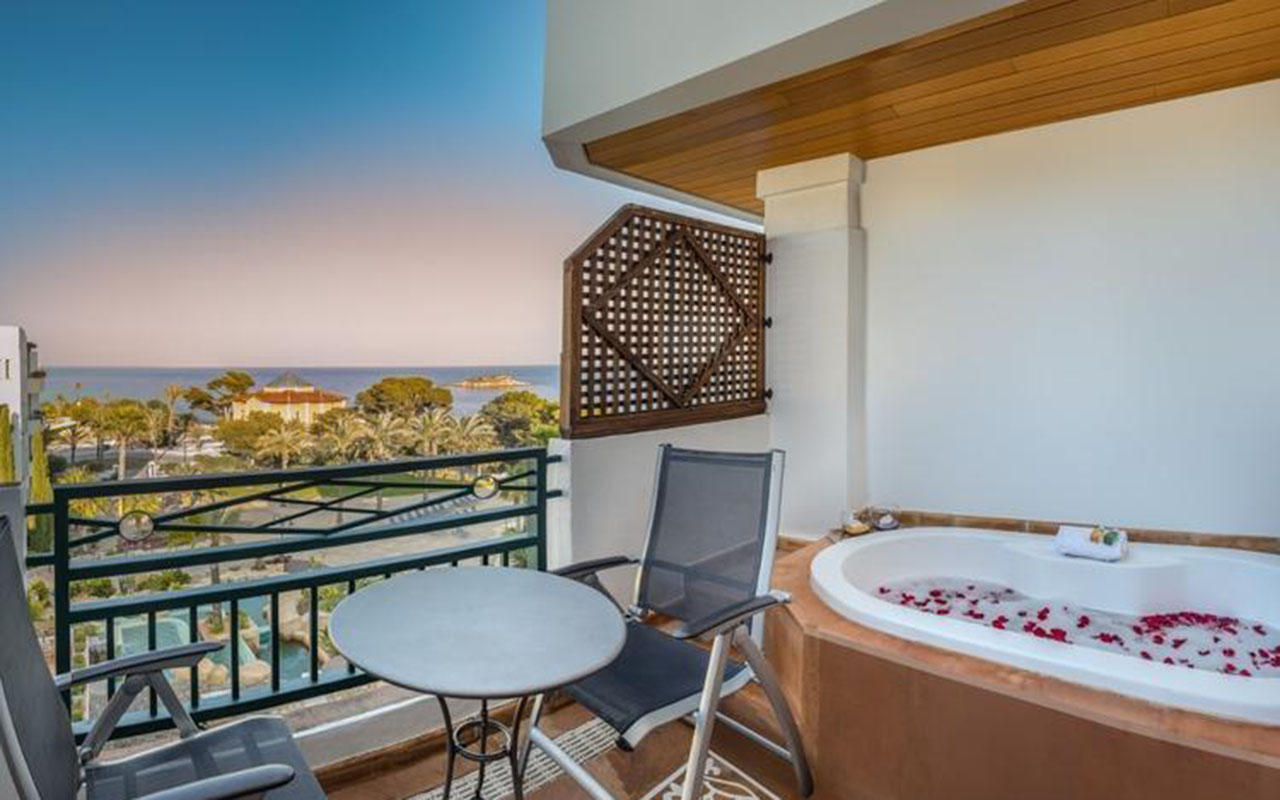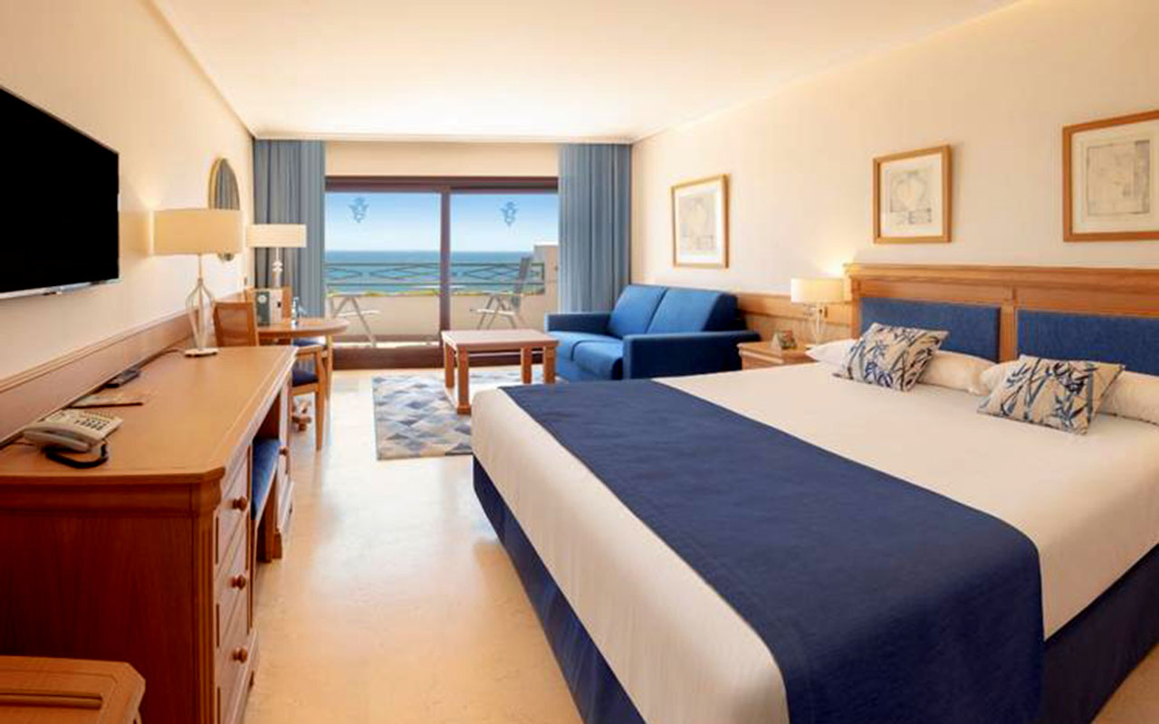 This luxury hotel has a total of 202 rooms, 145 of which are double rooms with mountain or sea views, 41 Deluxe double rooms, which are more spacious and have sea views, 15 Junior suites, also with sea views and a separate lounge, and a 180 m2 Presidential suite with stunning panoramic views and a terrace with a jacuzzi. It offers its guests innovative architecture, inspired by the typical white houses of the area, and numerous services and facilities such as a beautiful and spacious lobby, 24-hour reception and currency exchange service. It also has 5 meeting rooms with capacity for up to 300 people, a lobby bar, piano bar, cafeteria, 4 restaurants (not all of which operate simultaneously), room and laundry service, a 1,500 m2 spa with a thalassotherapy thermal area (with extra charge), a children's club (only in summer) and a garage with an extra charge.